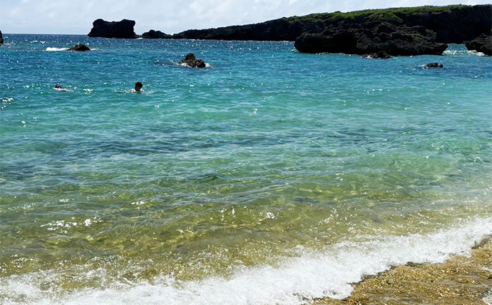 東平安名崎近辺のビーチ(提供:TSURINEWSライター・アングラー「K」)まず訪れたのは岩が点在するビーチ。妻はシュノーケリングで魚を探していましたが、「魚はいないよ……」と残念な報告。私も昨日と同様にプラグやスプーンをキャストしましたが、やはり反応なし。