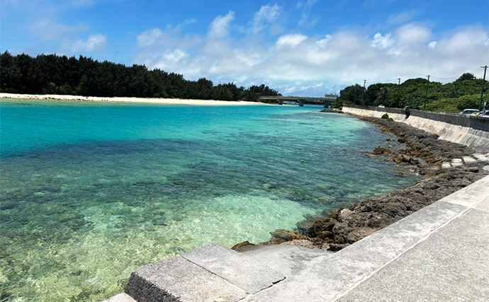 昼食をとり、午後の観光へ。下地島のビーチを巡っていると、岩が点在するポイントを発見しました。「この岩まわりには根魚がいるのでは?」そう思い、プラグやスプーンを投げてみましたが反応はなし。